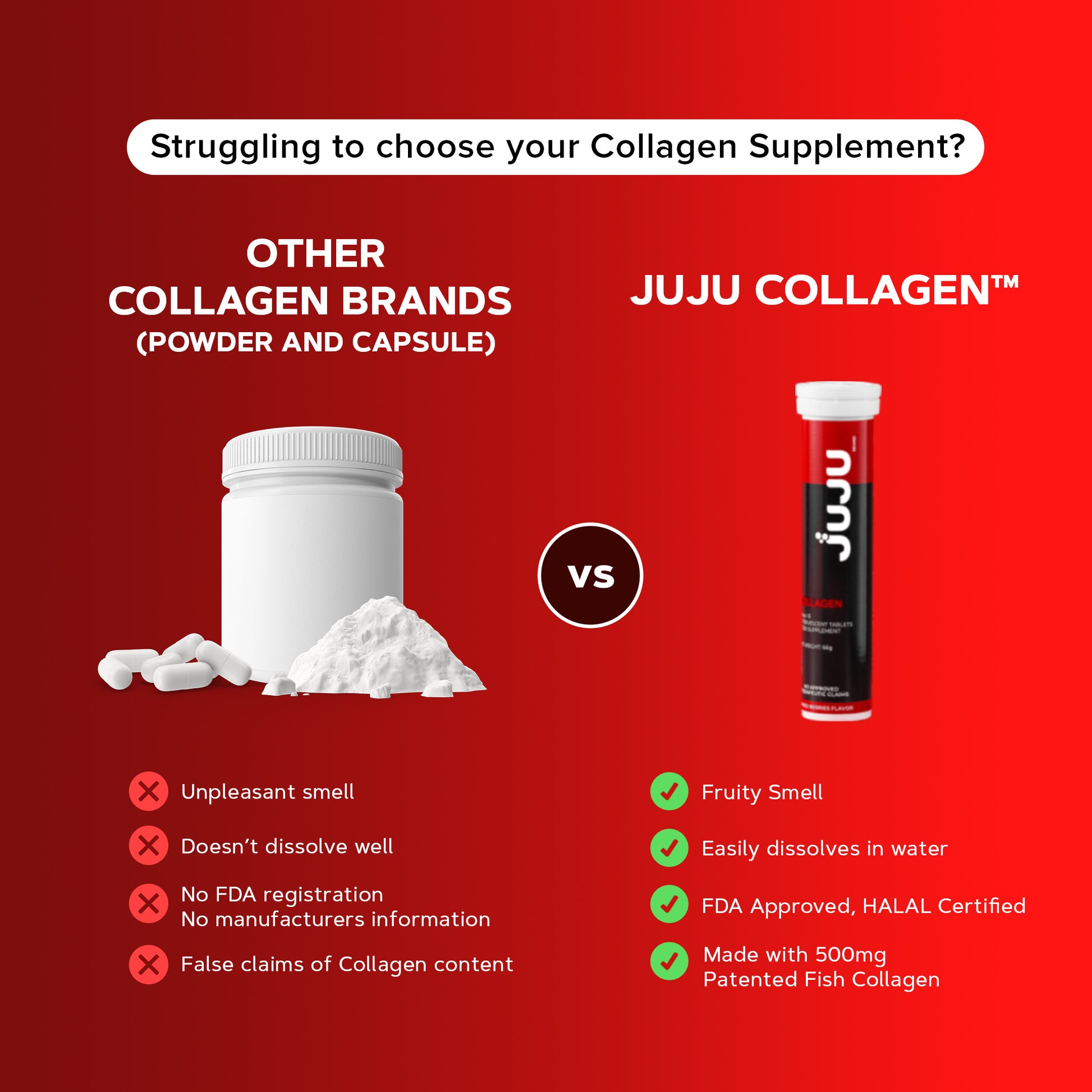 JUJU Collagen is a unique effervescent tablet, containing 500 MG of Patented Fish Collagen that promotes healthy, radiant and younger looking skin formulated with hydrolyzed Collagen Peptide for better absorption.